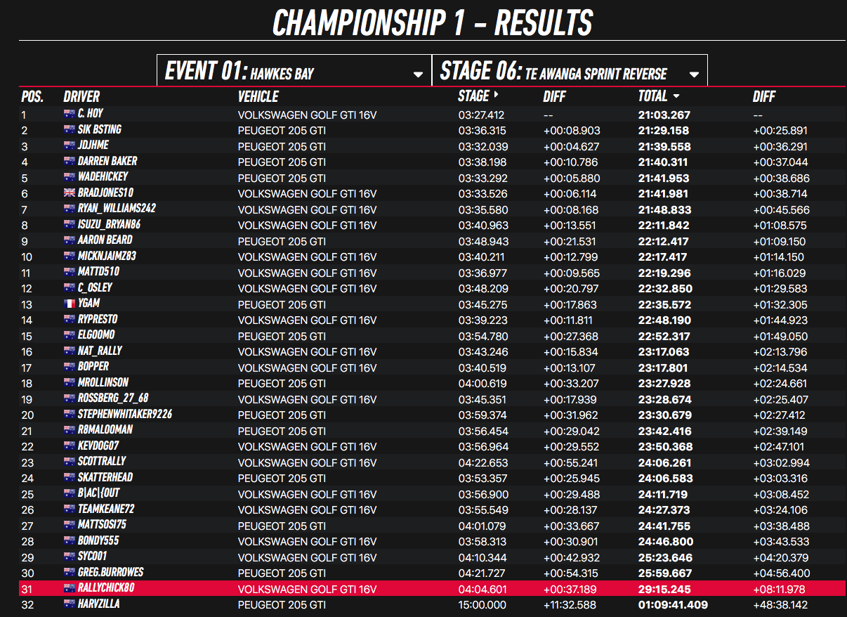 Stage 5 and former real life competitor Andrew Pearce (SIK BSTING) put in a stellar stage to finish second and maintain second for the rally, while the competition further back in the field was heating up with MROLLINSON in 16th to SCOTTRALLY in 21st only separated by just over 15 seconds. Down to the final stage and Hoy was able to put in other cracker of a time to finish the event 1stoutright a commanding 36 seconds ahead of Pearce and Kilbride with Baker, Hickey, Jones, Williams, Bryan Armstrong, Arron Beard and MICKNJAIMZ83 rounding out the top 10.
