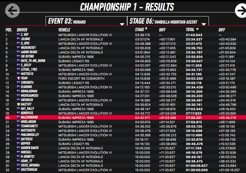 After a quick service the cars were back out on the stages for a repeat of the first loop. Over these stages the battle between the Mitsubishi Lancers of Mike Gill, BONDY555, ENFORCER, Jason Keane (TEAMKEANE72) and Matt Sosimenko (MATTSOSI72). ENFORCER came out on top of this battle in 17th place.