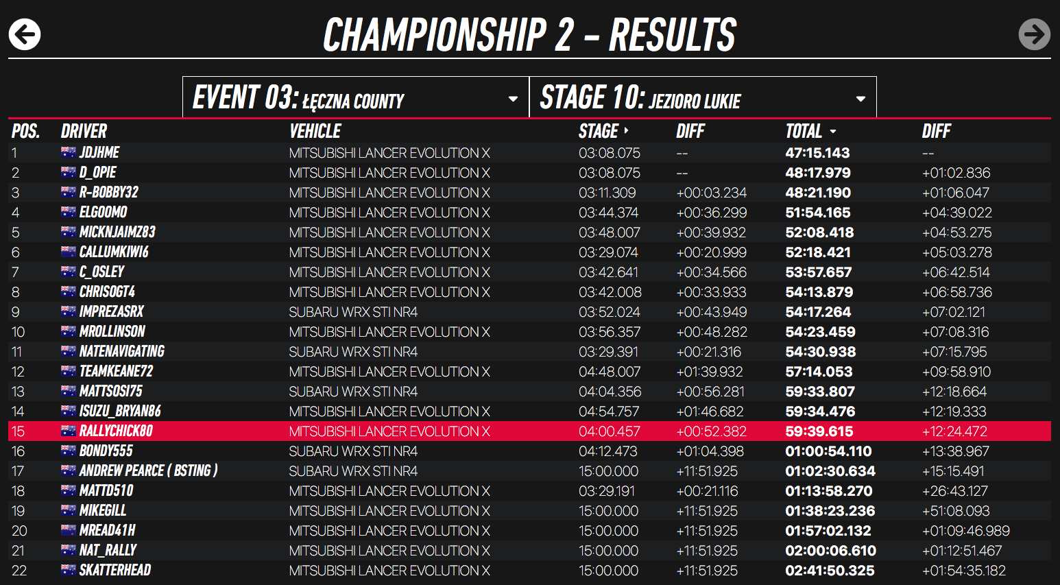 The strong field of 22 competitors then headed back out to complete a second pass over the five stages to finish up before the sun went down. The battle for the lead was hot with Kilbride and Opie once again trading stage times unfortunately for Opie a bad time on stage 8 and dropping a minute proved to be his undoing with Kilbride taking the win by 1 minute and 2 seconds from Opie with 4 seconds ahead of R-BOBBY32 in 3rd. The top 10 was rounded out by ELGOOMO, MICKNJAIMZ83, CALLUMKIWI6, C_OSLEY, CHRISOGT4, IMPREZASRX and MROLLINSON.
