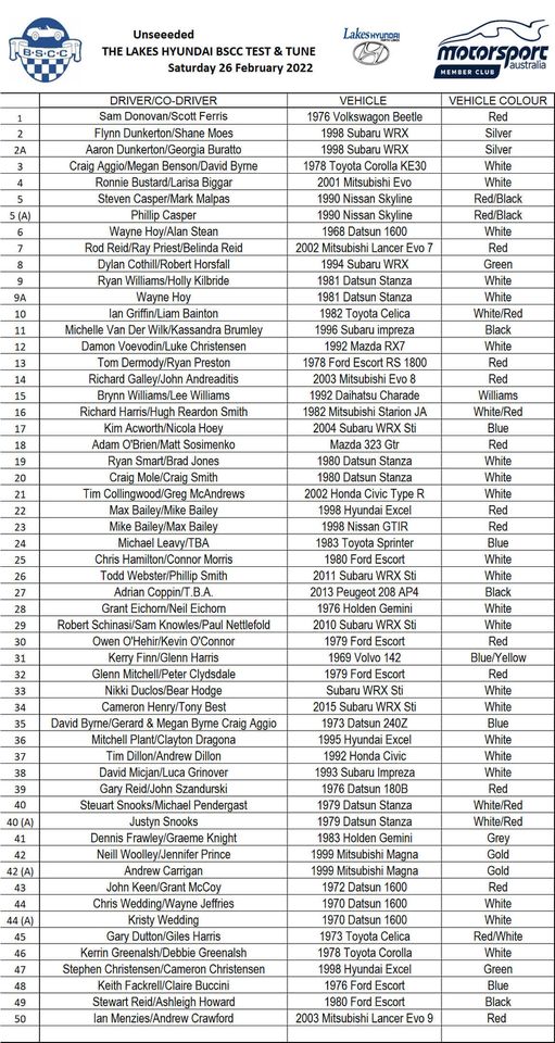 A full field of 50 Crews will attend the Lakes Hyundai Brisbane Sporting Car Club Test and Tune in Jimna on February 26th.